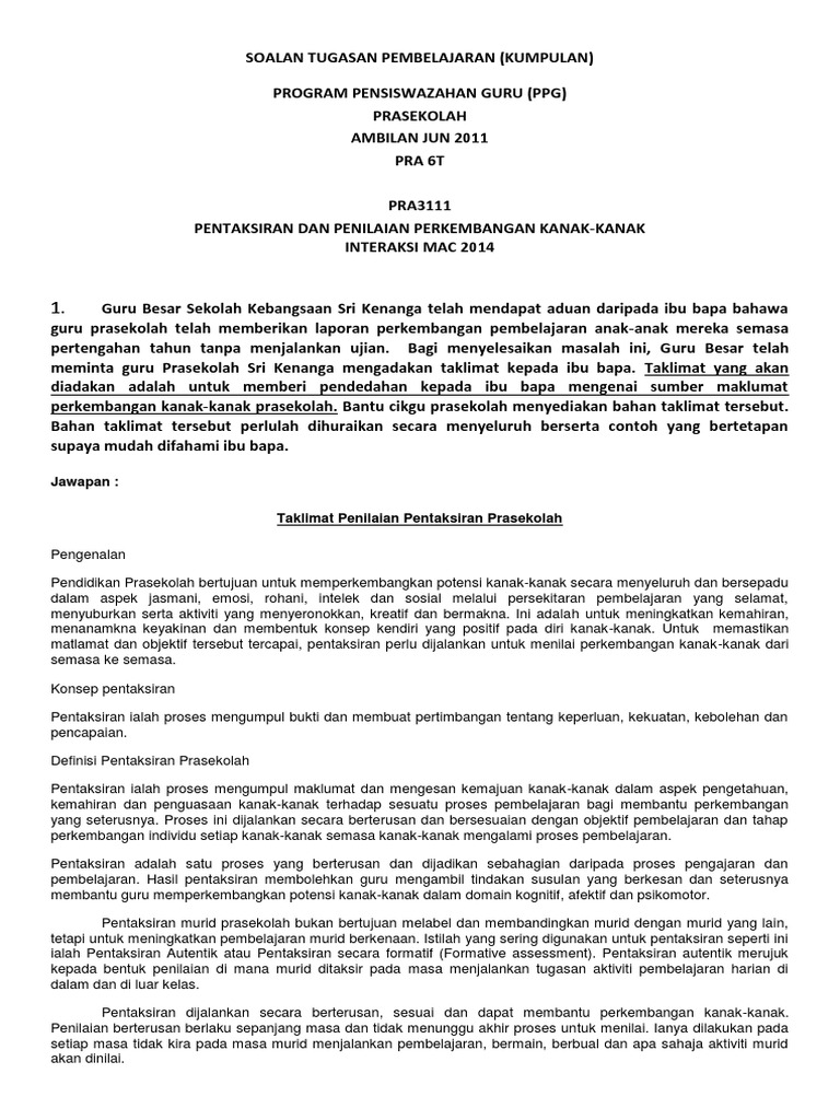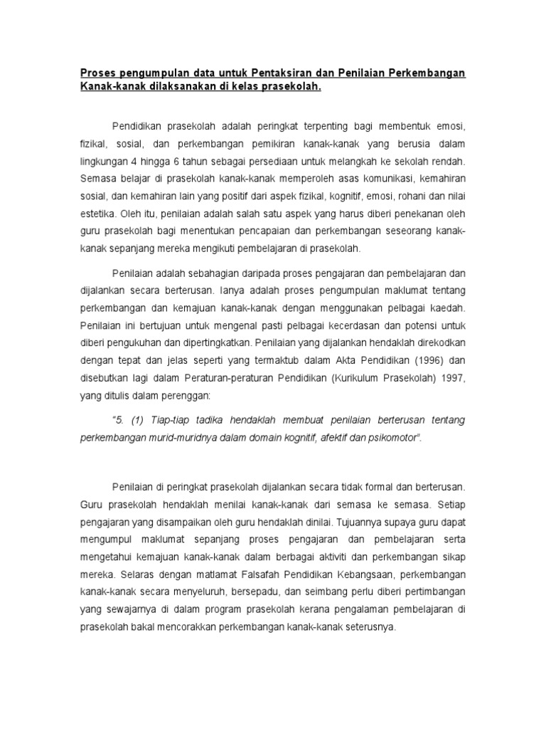 Pengumpulan Data Untuk Pentaksiran Dan Penilaian Perkembangan Kanak from imgv2-1-f.scribdassets.com Pentaksiran autentik merujuk kepada bentuk penilaian di mana murid ditaksir. Ini juga boleh berlaku dengan adanya sokongan daripada ibu bapa yang sering mendengar muzik sepanjang berada di dalam kereta atau rumah. Pentaksiran autentik lebih sesuai dijalankan bagi murid prasekolah. Perancangan rapi dan melibatkan permuafakatan sebagai ahli jawatankuasa. Merupakan satu proses yang sistematik untuk memperoleh maklumat perkembangan murid bagi membantu guru membuat penilaian. Pengarah jabatan siasatan jenayah bukit aman huzir mohamed. Salah satu daripada penilaian dan pentaksiran yang boleh dijalankan adalah melalui penyimpanan maklumat dalam portfolio. Kurikulum pendidikan prasekolah yang diberlakukan pada masa itu diimpor dari belanda.